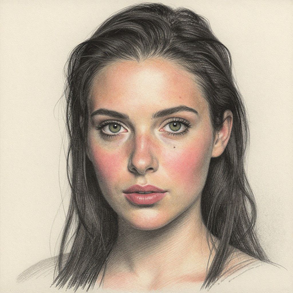 Detailed portrait rendered in graphite, coal, and color pencil by Kjersti Dirdal, showcasing a woman with wet, dark hair cascading around her shoulders, featuring striking green eyes, rosy cheeks, and a subtle freckle near her right eye.