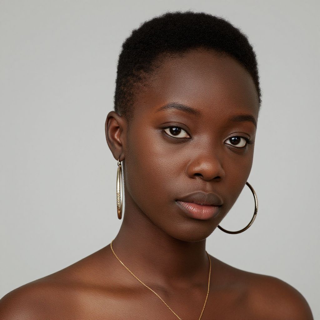 Photograph of a young African woman with short black hair, dark skin, and glossy lips, wearing a gold necklace and strapless black top, against