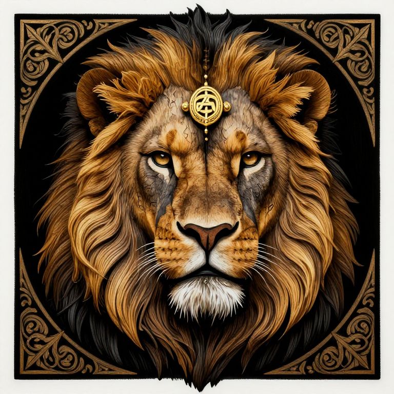 Digital art of a majestic lion with detailed orange-brown mane, gold medallion on forehead, intense gaze, framed by ornate black borders.