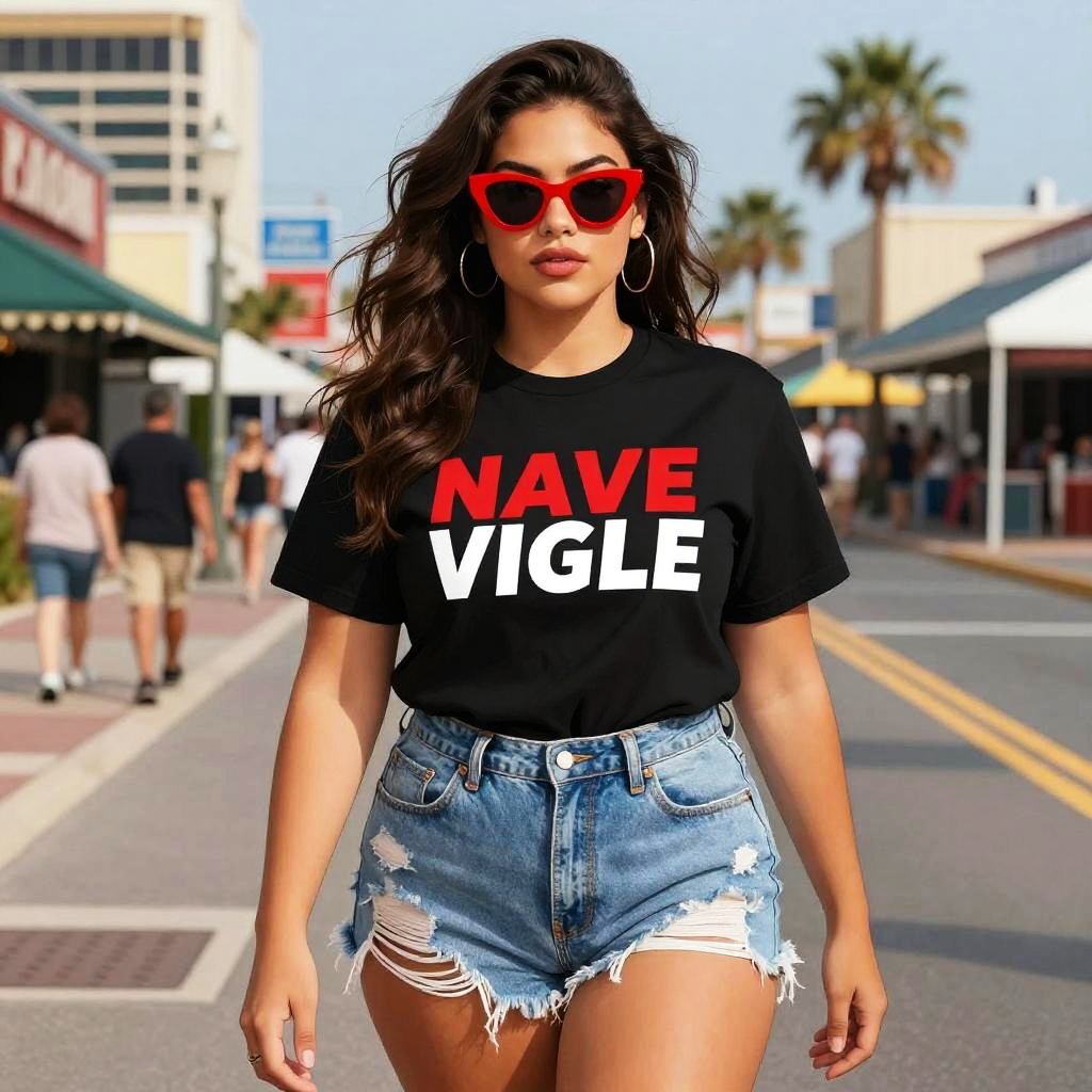 A Curvy woman in casual streetwear, wearing a black graphic t-shirt with bold red and white text and distressed light blue denim shorts, stands confidently at a fashionable boardwalk in Atlantic City. She sports sharp-angled red sunglasses and has a wrist tattoo, all illustrated in a vibrant image comics style. Sexy. Pretty face and beutiful eyes