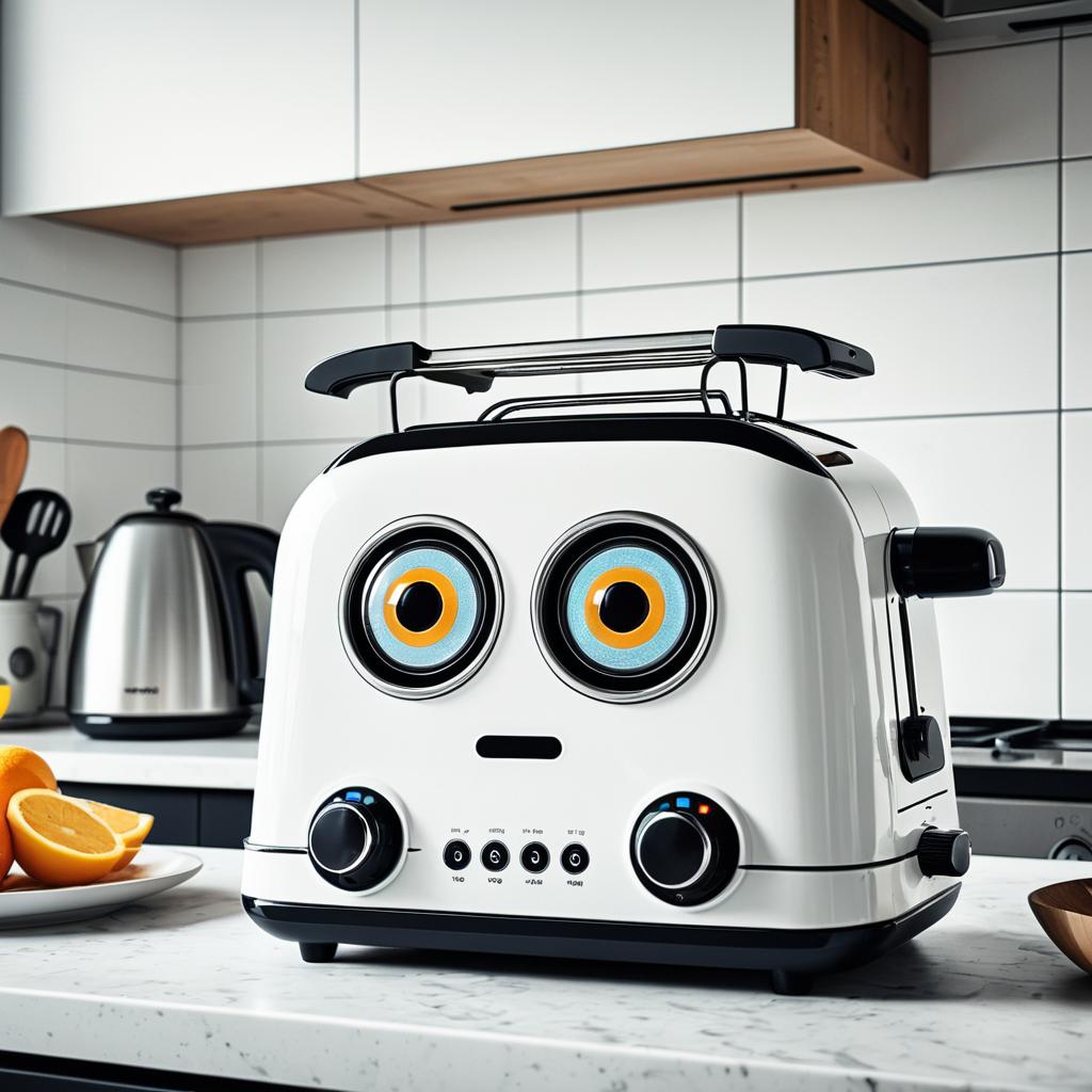 Close-up of a quirky blue kitchen toaster designed to resemble a robot with big expressive eyes and circular features, placed on a white marble countertop in a modern, bright kitchen interior. The background includes kitchen elements such as a wooden pan, toaster slots, a glass window, fresh fruit, and a potted plant, highlighting a family-friendly and vibrant kitchen setting.