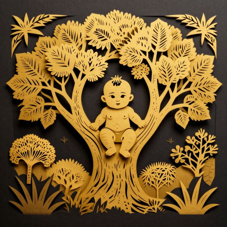 The image is a stunning, multi-dimensional paper cut craft that depicts a Māori baby at the center of a tree, surrounded by New Zealand bush. The intricate details and textures of the paper cut are highlighted by the golden color, creating a warm and vibrant contrast against the dark background. The baby, positioned centrally, is nestled among the branches and leaves of the tree, which are meticulously crafted to resemble the natural environment of New Zealand. The bush, with its dense foliage and varied shapes, frames the scene, adding depth and a sense of enclosure. The overall composition is balanced, with the baby and tree at the heart of the image, while the bush elements extend outward, creating a harmonious and visually engaging piece. The paper cut's complexity and precision in capturing the essence of the Māori culture and the natural landscape of New Zealand are evident in the detailed rendering of the baby, tree, and bush.