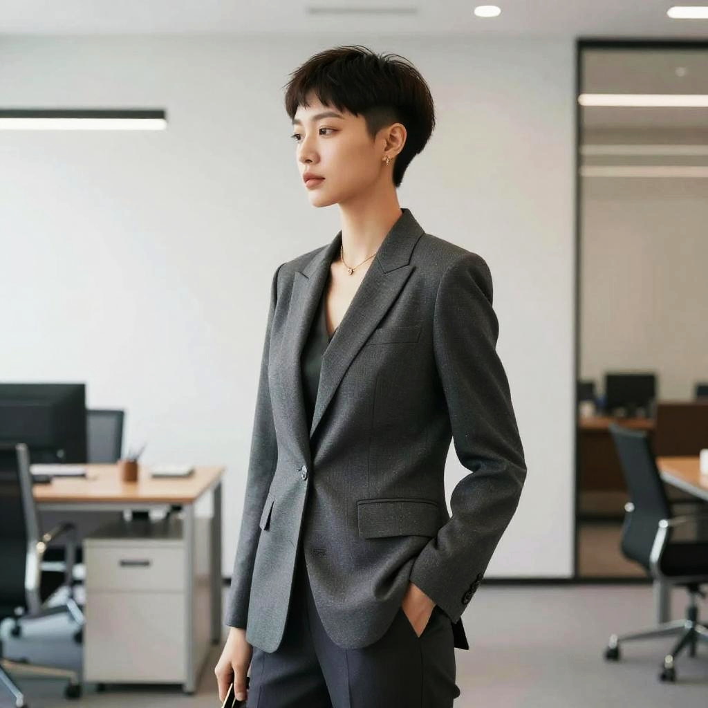 Nape Undercut hairstyle on female entrepreneur, wearing sharp tailored blazer, in minimalist office lobby, captured in fashion editorial style with subtle ambient daylight.