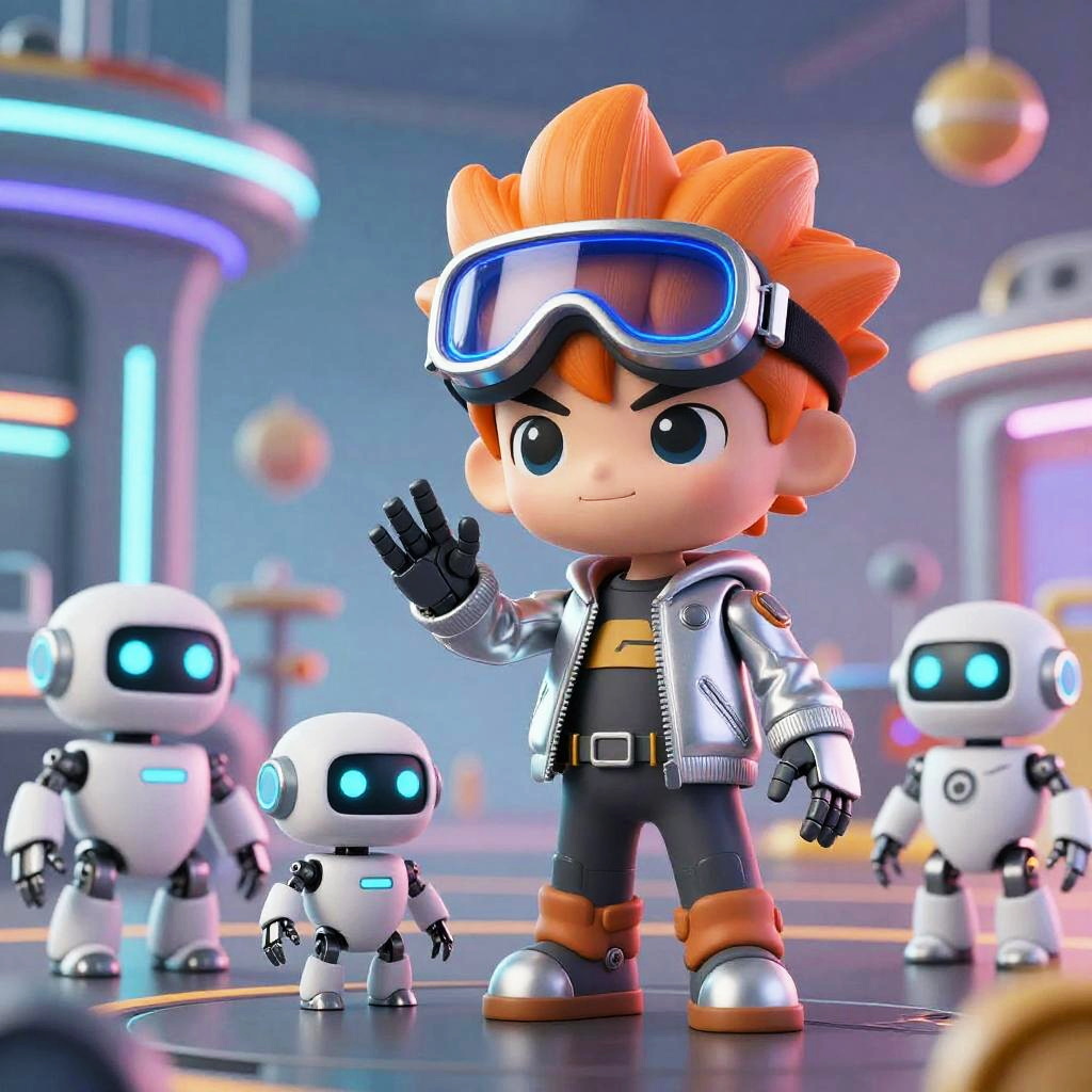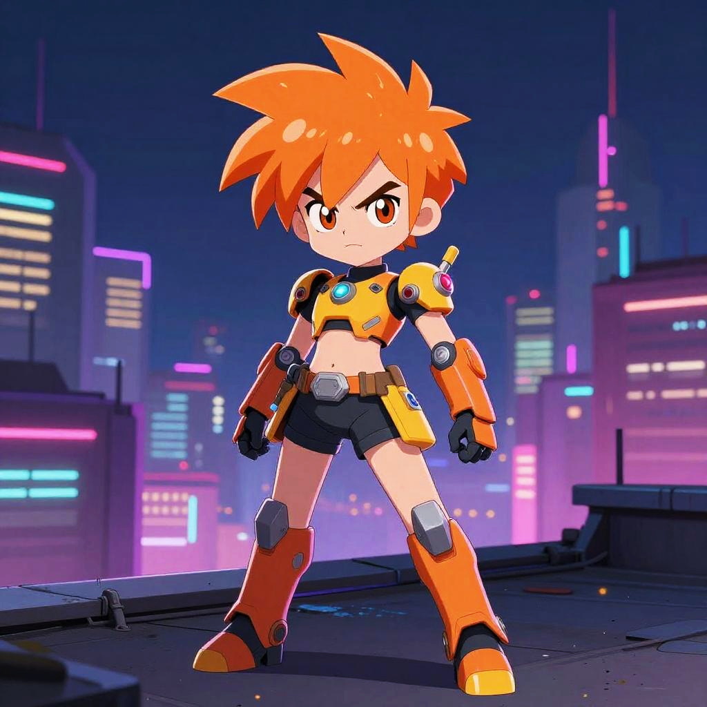 Orange haired cartoon girl with spiky hair, wearing futuristic armor, posing heroically on a neon-lit city rooftop at night, dynamic lighting, cyberpunk aesthetic with bright contrasting colors and sharp line art