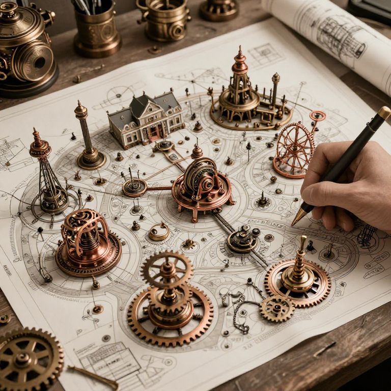 Theme park map creator crafting a steampunk-inspired layout for an amusement park filled with mechanical rides and Victorian architecture, sepia tones with copper and brass details, detailed gears and cogs motifs, a meticulous artisan at work in a workshop filled with blueprints.