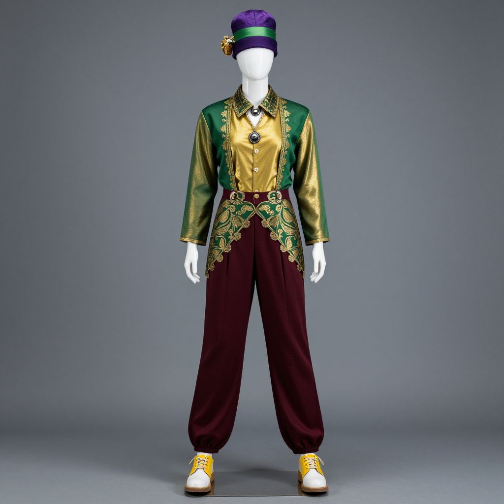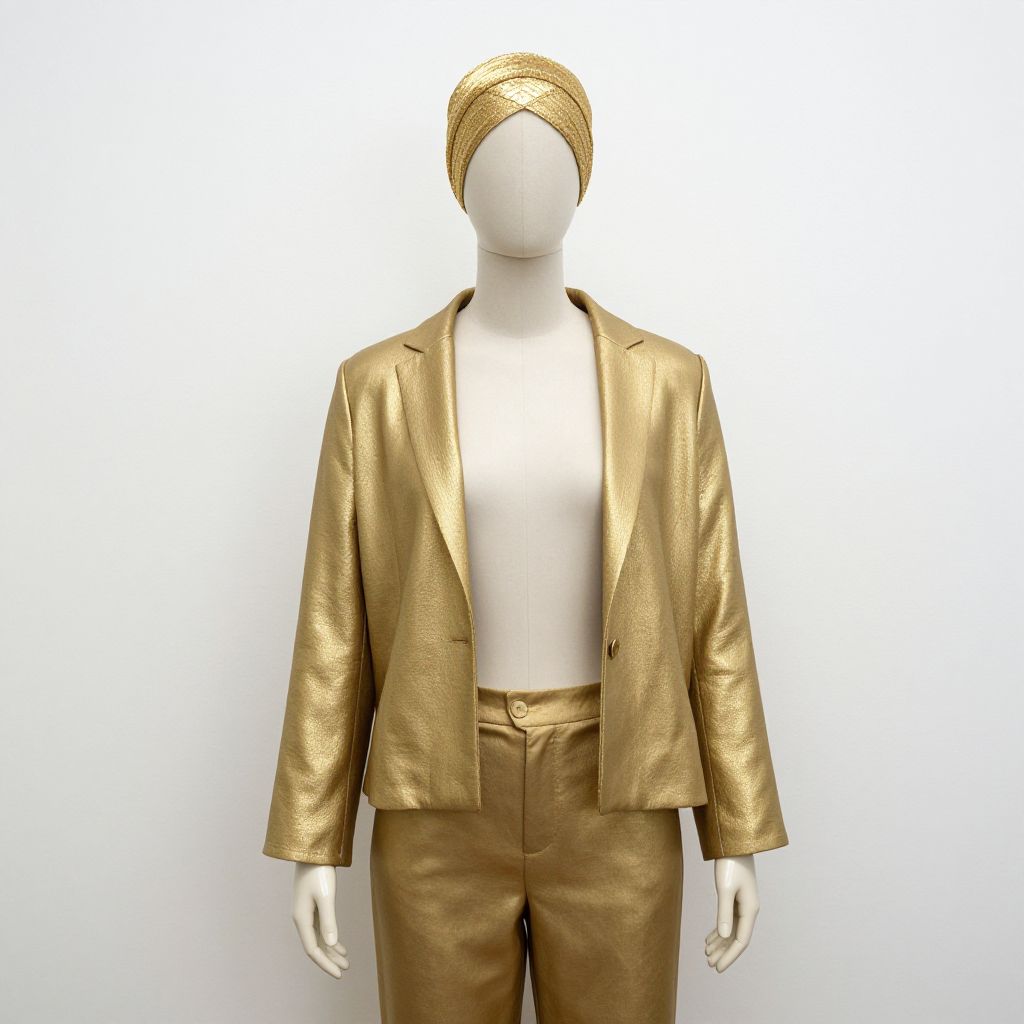 Mannequin wearing a golden costume with a golden headpiece and a golden jacket. The person is standing in front of a white wall.