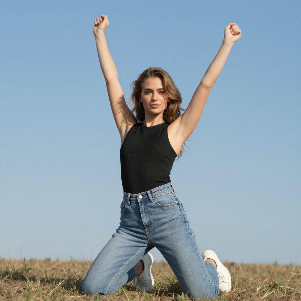 Photograph of a young woman with light brown hair, wearing a black sleeveless top and blue jeans, kneeling on dry grass with arms raised in a triumphant pose. She has white sneakers and a bright blue sky background. Her expression is confident and energetic.