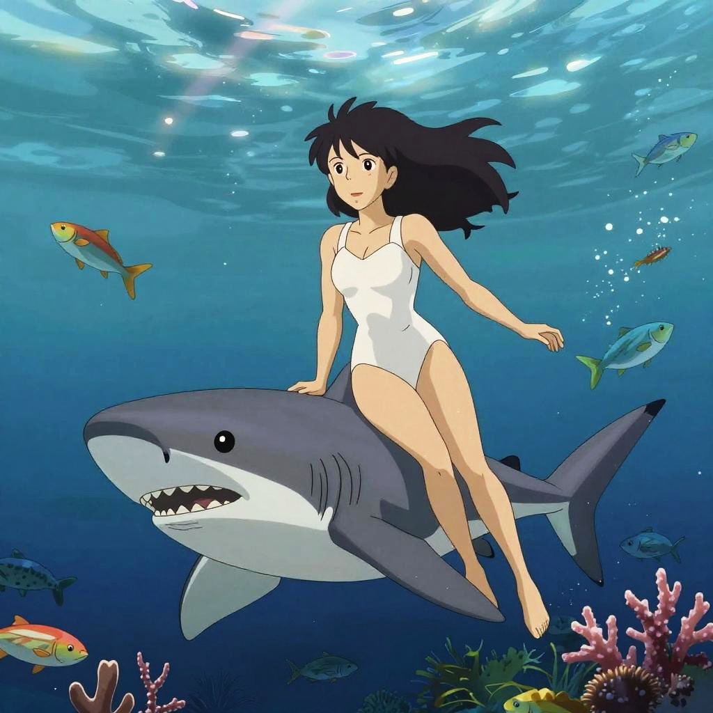 Masterpiece, fantasy, best quality, anime style, wide-angle, full body shot, front view, beautiful_woman in white_swimsuit, riding a 1shark under the water, fishes and corals in background, reflective water, natural lighting, soft lighting, (featured on pixiv:1.25), trending on artstation, precise line-art, (Studio ghibli style, Art by Hayao Miyazaki:1.2), Anime Style, Manga Style, Hand drawn, cinematic sensual, Sharp focus, humorous illustration, big depth of field, Masterpiece, concept art, Vivid colors, Simplified style, trending on ArtStation, trending on CGSociety, Intricate, Vibrant colors, Soft Shading, Simplistic Features, Sharp Angles