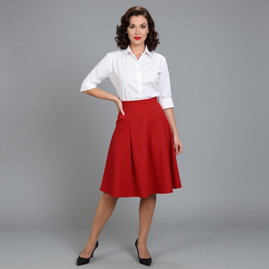 Photograph of a fair-skinned woman with dark, wavy hair styled in vintage curls. She wears a crisp white blouse with three-quarter sleeves and a high-waisted, knee-length red skirt that flares slightly. Her black high heels complement the classic look. She stands against a plain gray background, with one hand on her hip and the other relaxed by her side. Her makeup is subtle, with red lipstick matching her skirt. The overall style is reminiscent of 1950s fashion, exuding a polished, retro charm.