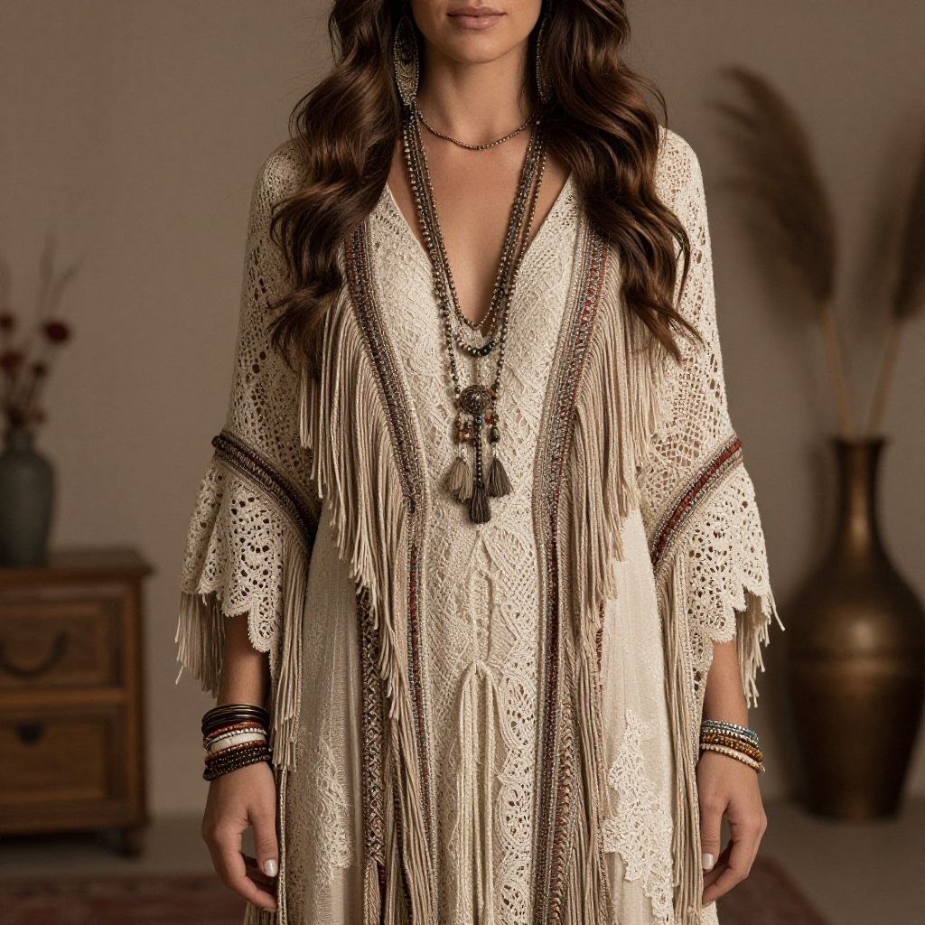 A woman with long wavy hair stands indoors, dressed in an elegant bohemian-style outfit featuring intricate fringes and lace. She wears multiple layered necklaces and bracelets, highlighting the rich textures and earthy tones of her look in a warm, sepia-toned setting.