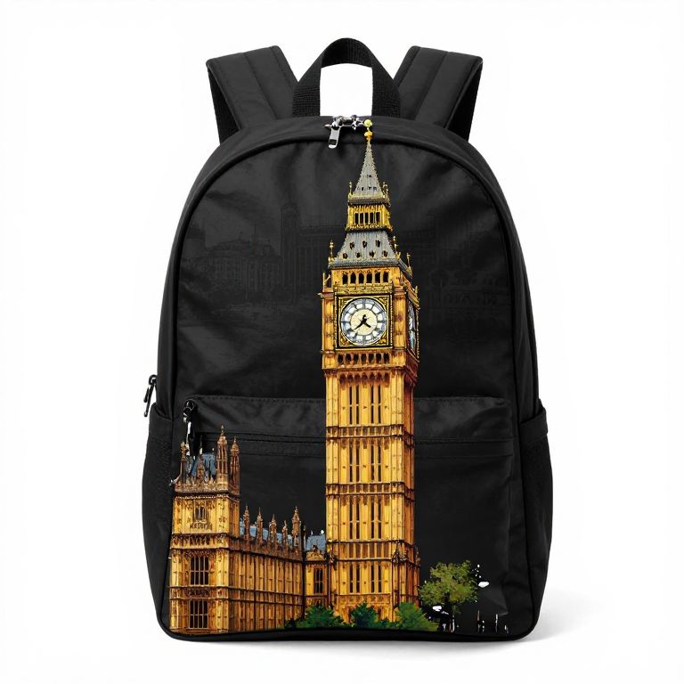 Black backpack with a vibrant, detailed digital illustration of London's illuminated Big Ben clock tower and surrounding buildings on the front.