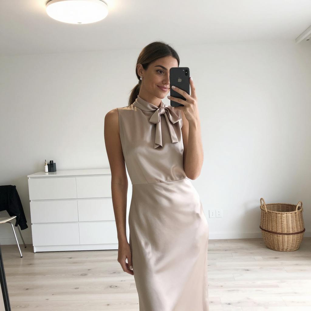 Slim woman with long brown hair in a ponytail wearing a sleeveless beige silky gown with a bow neckline. She is taking a mirror selfie with a smartphone in a modern, minimalistic room featuring light wood flooring, white dresser, a wicker basket, and a black jacket on a chair.
