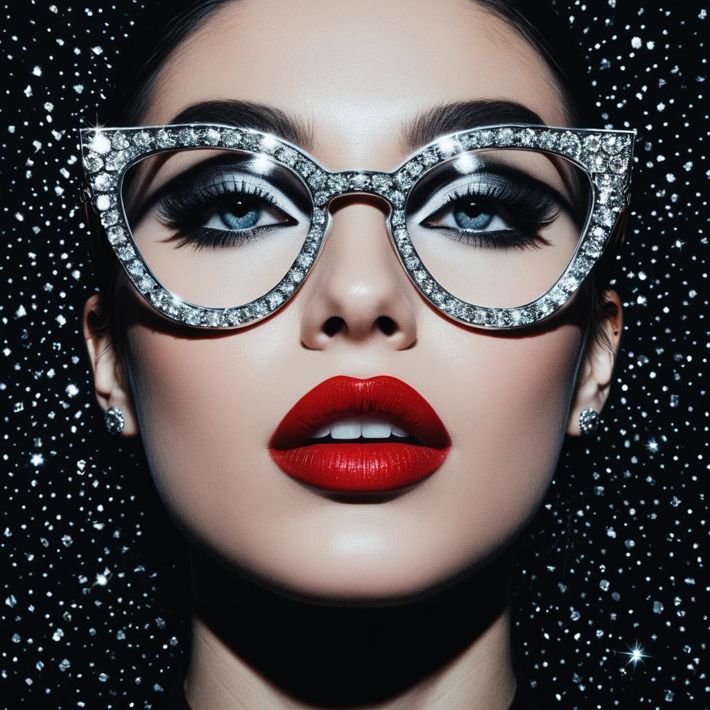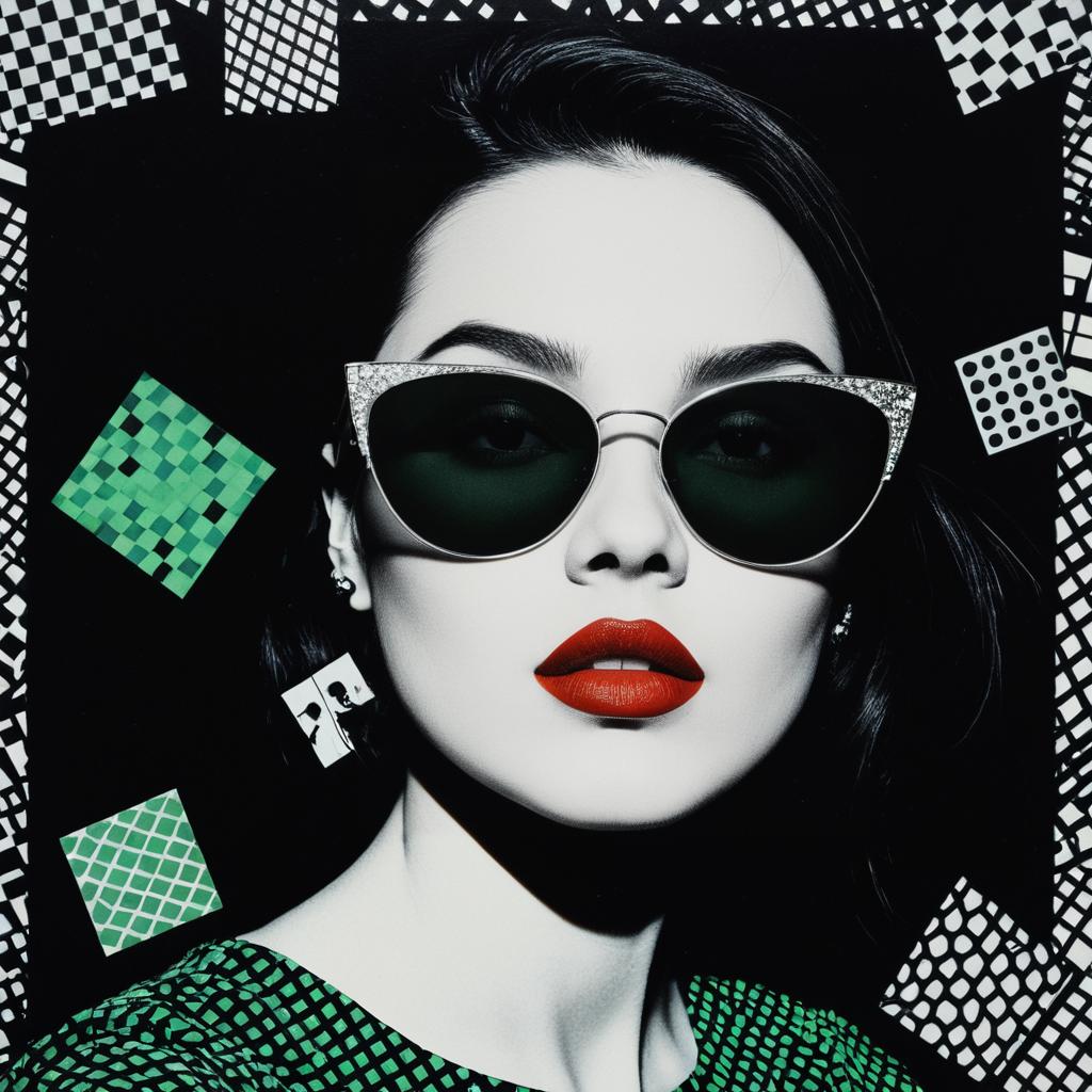 Close-up portrait of a woman with coral red lipstick and red-tinted sunglasses on a black background, with stylized flames digitally surrounding her head. Psychedelic pop art style with high contrast and vibrant colors, emphasizing bright red lips and sunglasses frames against pale skin.
