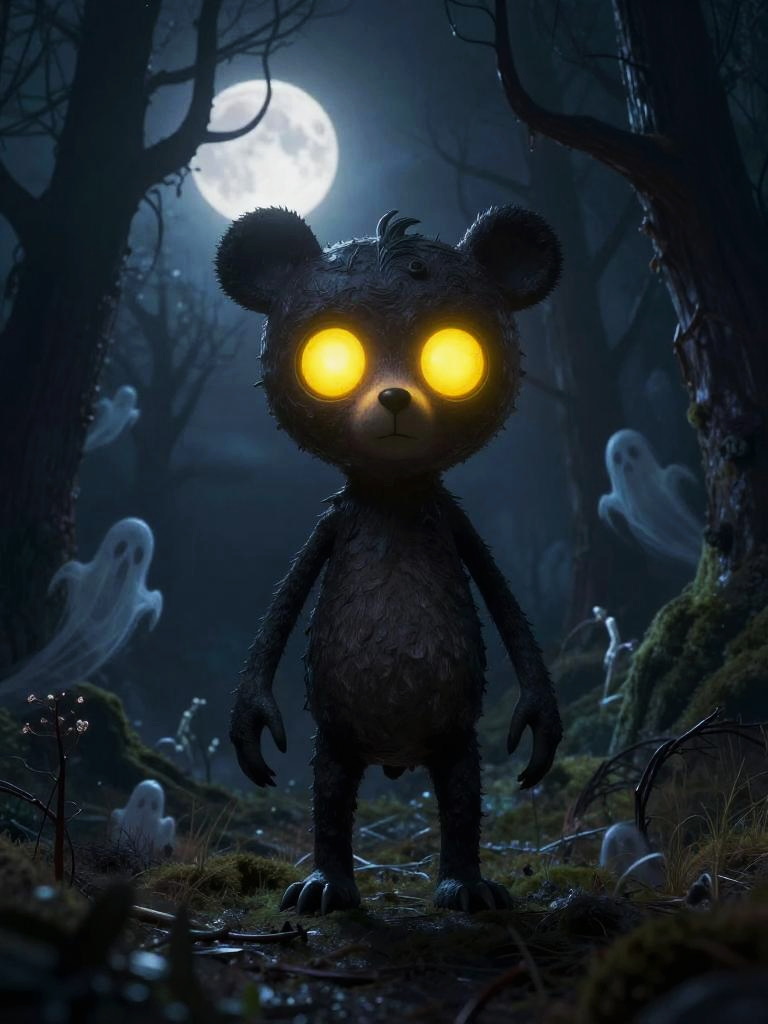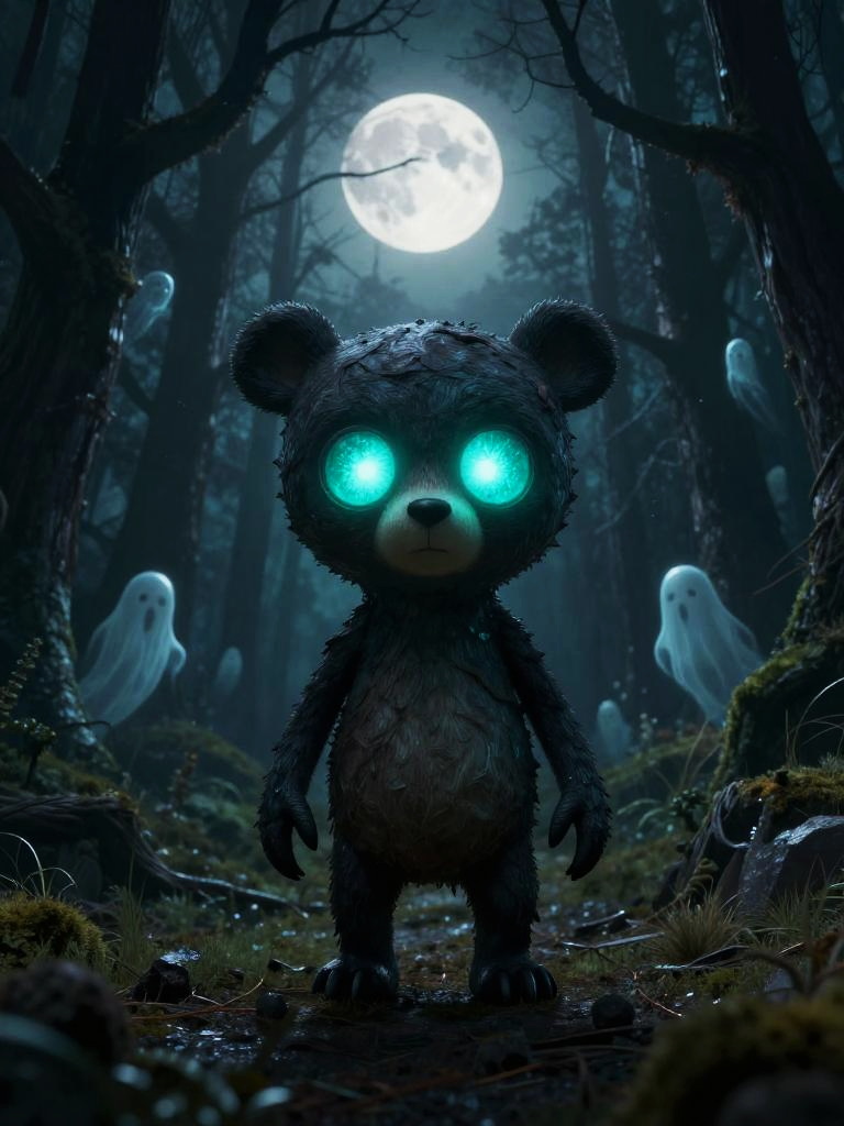 Digital illustration of a glowing-eyed, dark-furred teddy bear in a moonlit, haunted forest with ghostly figures and eerie mist.