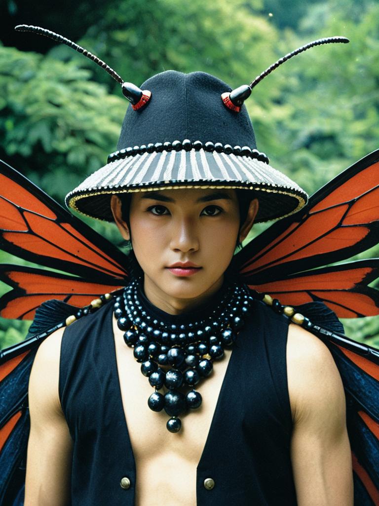 Insect hashira costume, 1boy, solo, male focus, wings, looking at viewer, insect wings, hat, upper body, antennae, beads