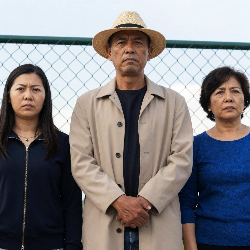 Photograph of three people behind a chain-link fence. Man in beige coat and straw hat stands center, holding hands with woman in blue patterned top, woman with dark hair in navy jacket to left. Bright sky background. Intense expressions.