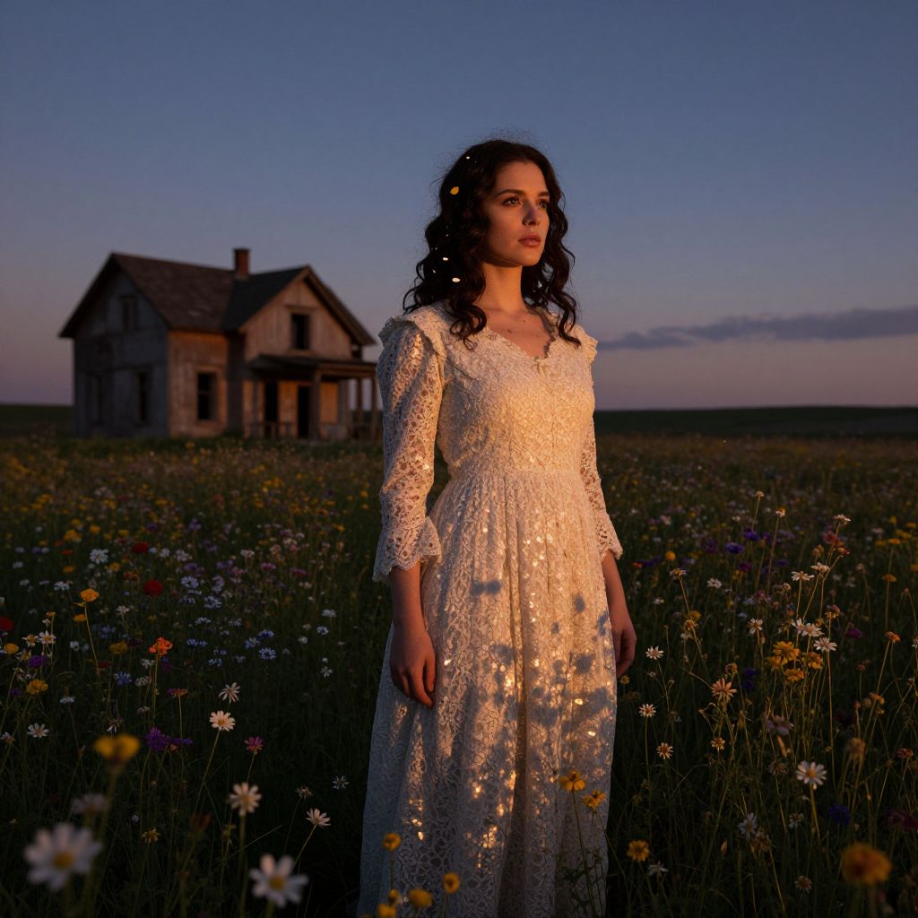 A woman adorned with dark, wavy locks stands amidst a field of vibrant wildflowers at dusk, her antique lace dress blending seamlessly with the landscape as petals intertwine with her hair and gown. In the distance, an abandoned house casts long shadows across the scene, its dilapidated facade contrasting sharply with the blooming beauty surrounding it. As the sun sets, light dances upon the lace of her dress, creating a mesmerizing shimmer akin to fireflies against the deepening hues of the sky. This captivating portrait blends old-world elegance and natural wonder in perfect harmony.