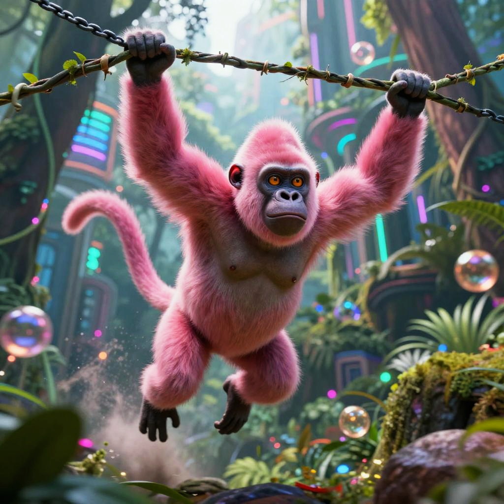 Pink gorilla tag monke swinging wildly through vibrant neon jungle, glowing vines intertwining with futuristic cityscape, dynamic motion blur, energetic and playful atmosphere, detailed fur texture and bright expressive eyes, sci-fi adventure style.