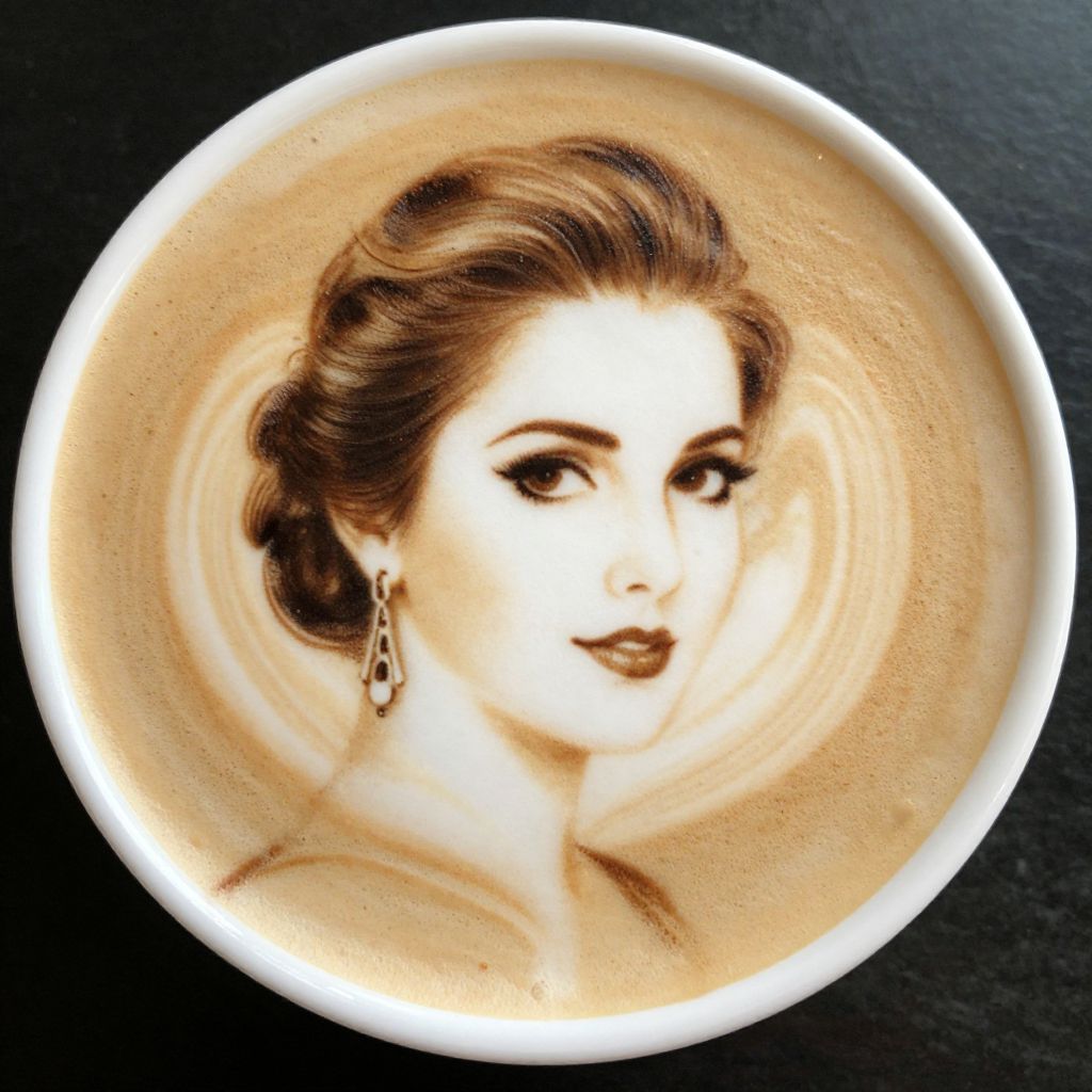 Expertly crafted coffee art showcases a detailed portrait of a woman with elegant hair styled in an updo, adorned with dangling earrings, set against a creamy latte background.