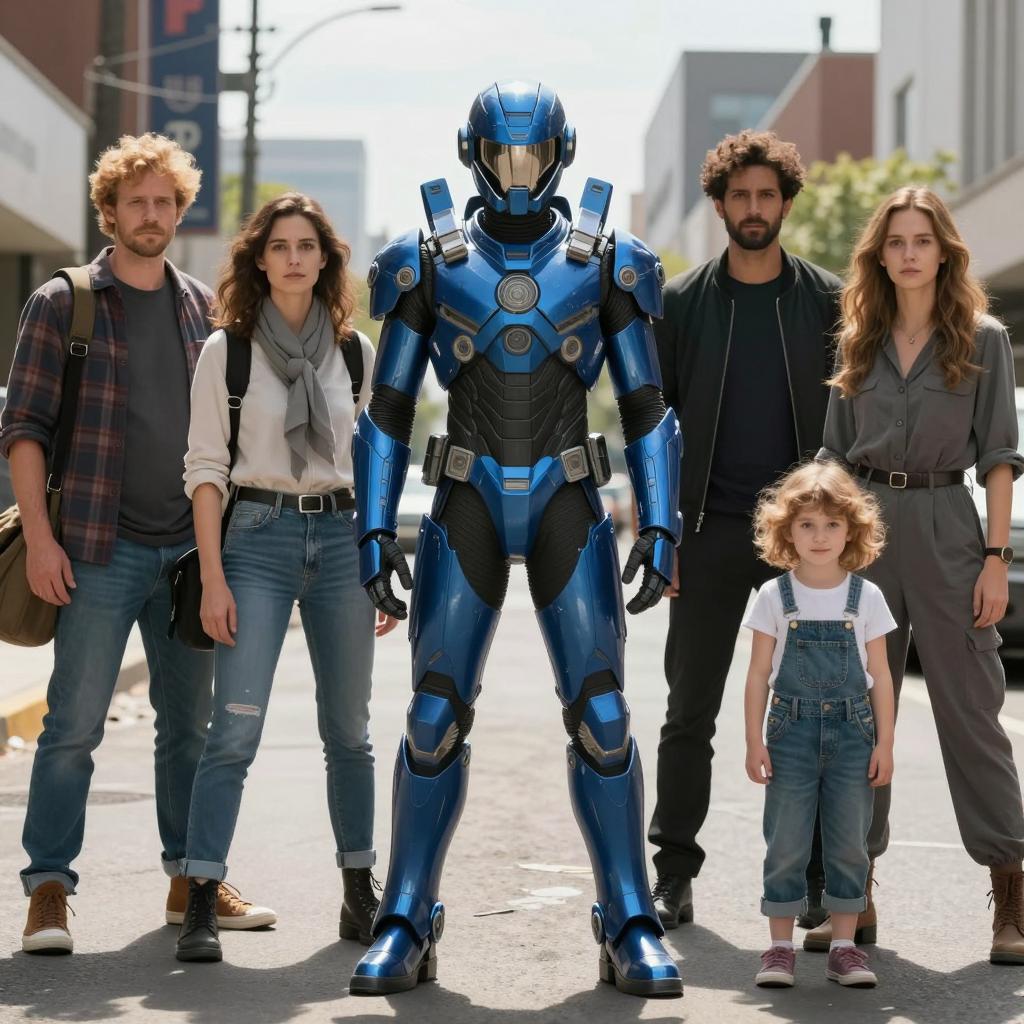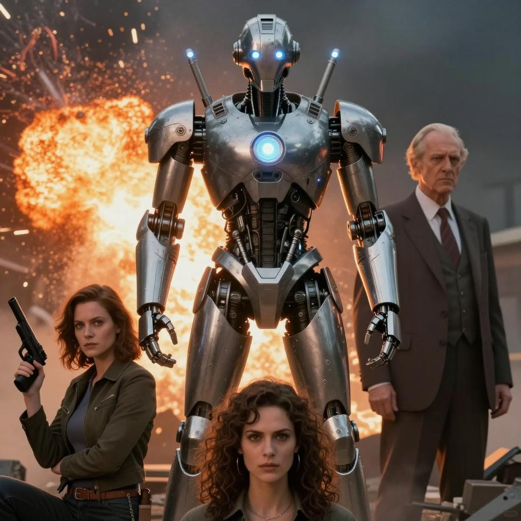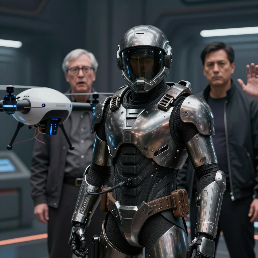 Science fiction scene. Metal-clad soldier in front, helmet with visor down. Robotic drone on left, wires connected. Older man with glasses in background, shocked expression. Another man in black jacket, hand raised, serious expression. Dark, futuristic setting.