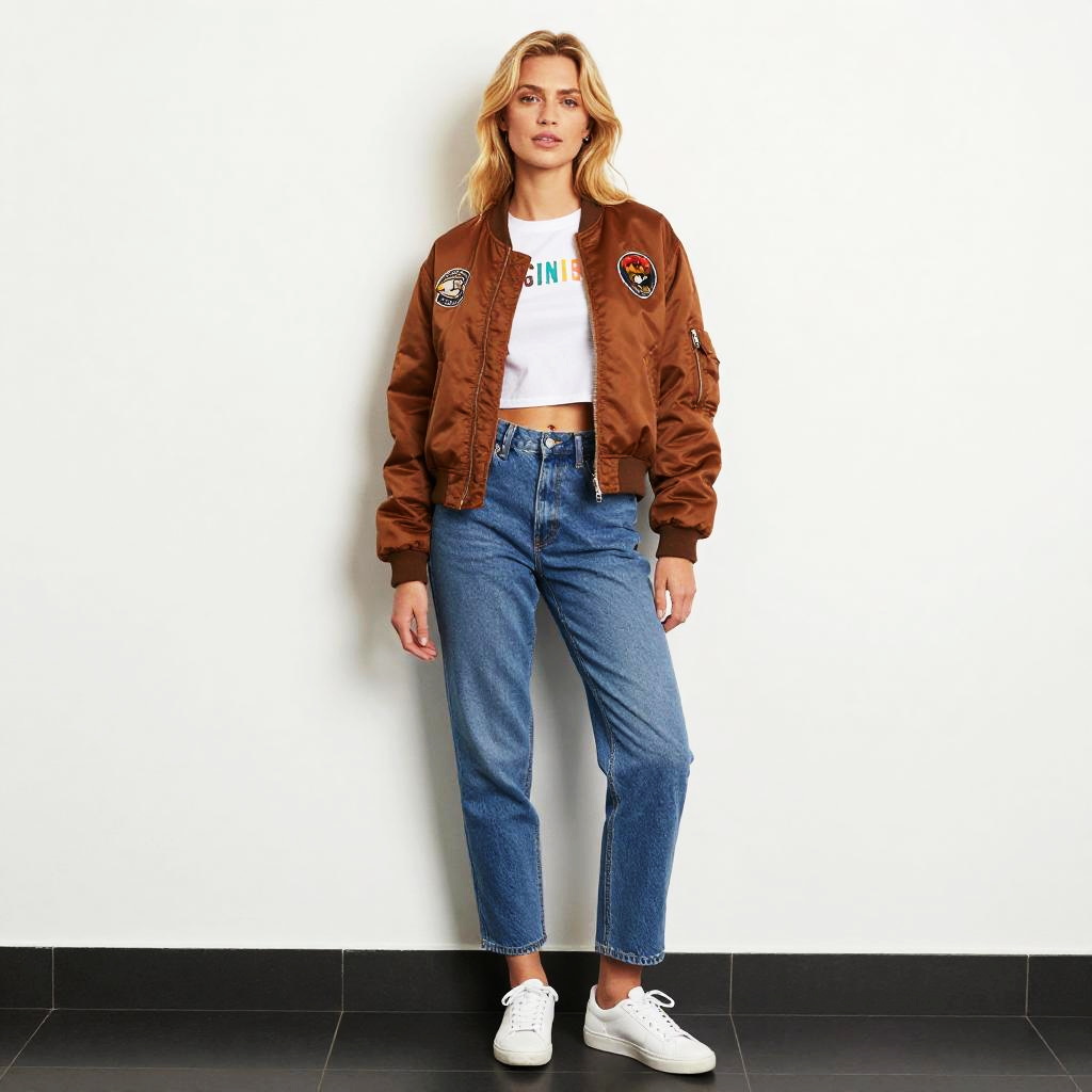 Photograph of a blonde woman standing against a plain white wall. She's wearing a cropped white top with colorful text, a brown bomber jacket with patches, high-waisted blue jeans, and white sneakers. Her hair is loose and slightly wavy, and she's looking directly at the camera with a neutral expression. The black tiled floor contrasts with the white background.