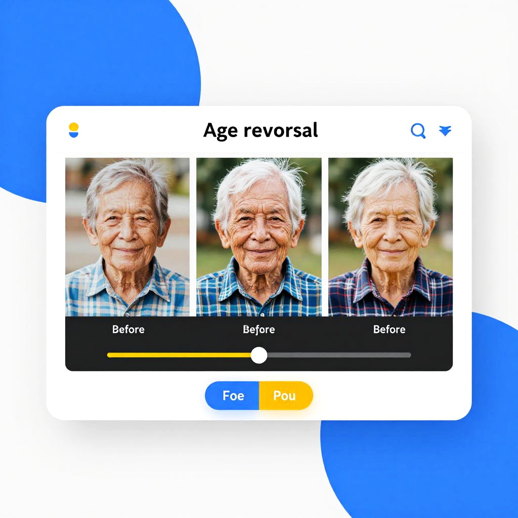 Old to young photo editor online free, a website homepage showcasing an interactive age reversal slider on a person's photo, bright and engaging colors, modern flat design, intuitive controls with before and after previews, dynamic composition