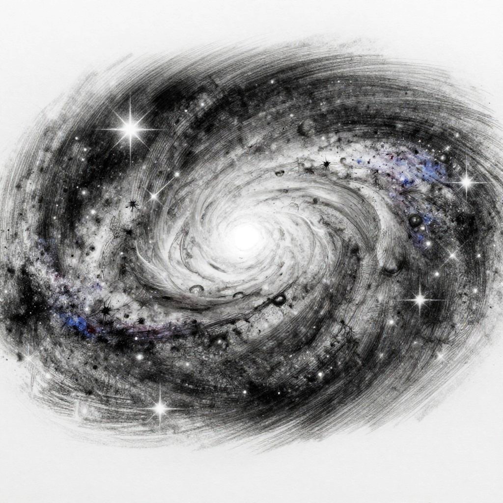 How to draw a galaxy with pencil, detailed step-by-step sketch, swirling stars and nebulae, soft shading and blending techniques, cosmic depth with light and shadow, monochrome artistic drawing tutorial, realistic pencil art