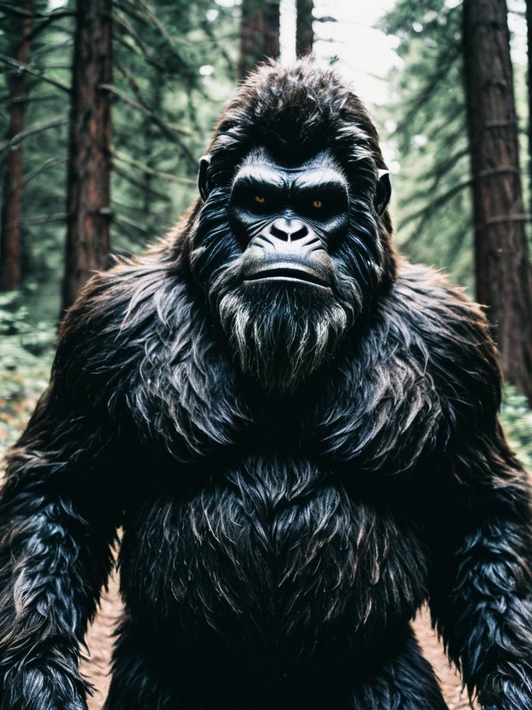 Editorial waist-up portrait of a man wearing a highly detailed and realistic Bigfoot costume, set in a dense forest environment. The costume features dark brown and black fur with a textured, muscular build and a serious facial expression, emphasizing the mythical creature look.