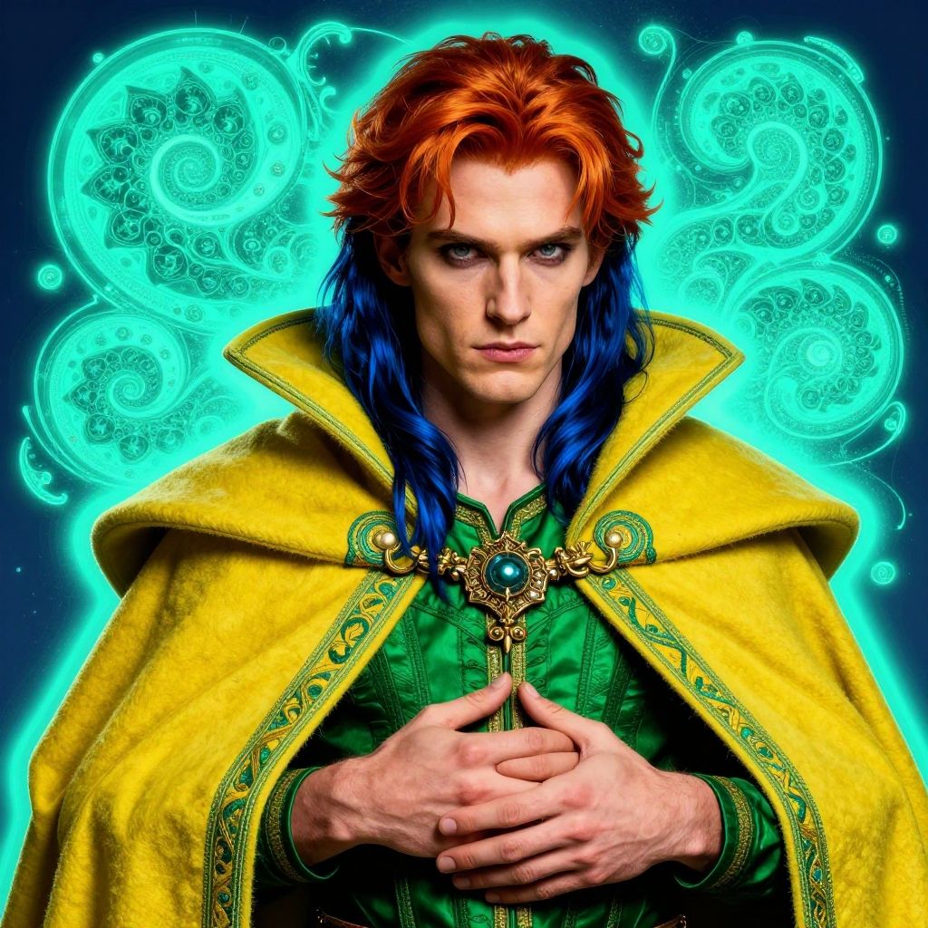 Turquoise outline of fractal He was a royal bastard with auburn hair, a sharp jawline, and eyes the color of stormy seas, bearing the weight of his illegitimate birth and royal destiny. in a Yellow Green Woolen cloak lined with silk and embroidered along the edges green bra, Blue black hair GTA-style artwork . satirical, exaggerated, pop art style, vibrant colors, iconic characters, action-packedPeter Chung, natural, shimmering, vibrant, gothic, rpg, 1400ad, ultra detailed, detailed, immersive, reminiscent of high fantasy RPG games, HD, masterpiece, best quality, hyper detailed, super realistic, perfect face, perfect hands, award-winning, professional, breathtaking