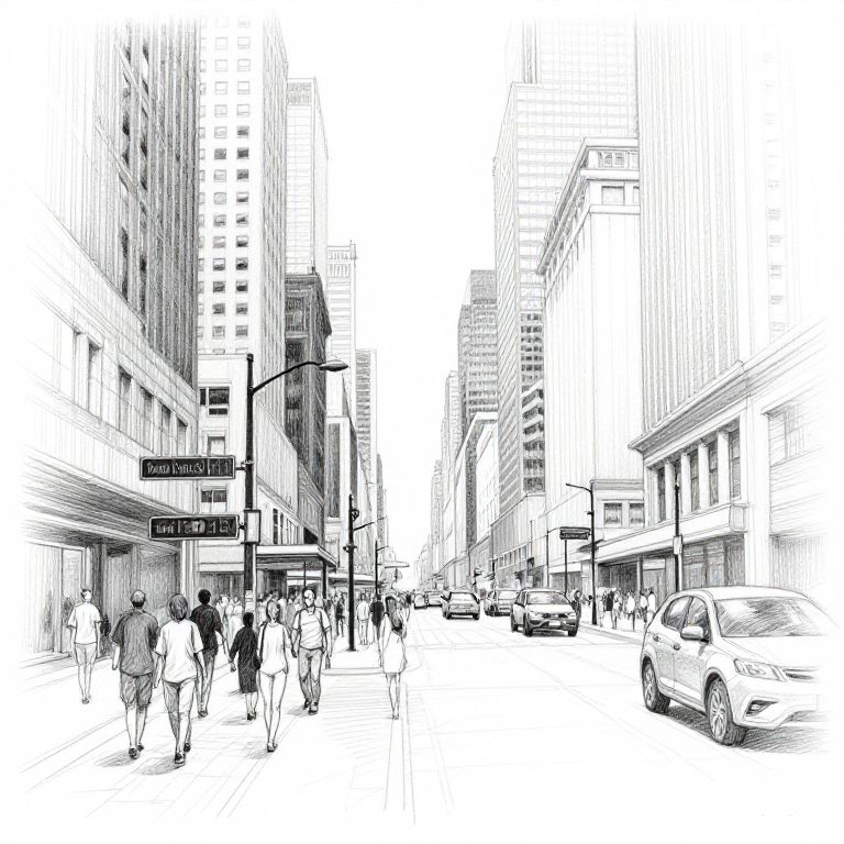 Make a photo a sketch of an urban city street bustling with people, intricate line work showing the architectural details of skyscrapers, street signs, and vehicles, with crosshatching techniques to emphasize light and shadow, giving a dynamic and vivid pencil drawing effect.
