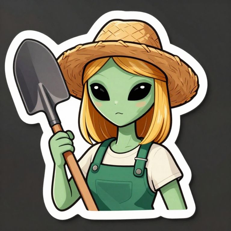 Illustration of an extraterrestrial female gardener with green skin and shoulder-length blonde hair, wearing a straw hat and green overalls over a white shirt, holding a shovel. The artwork is in a sticker style with a white outline on a dark background.