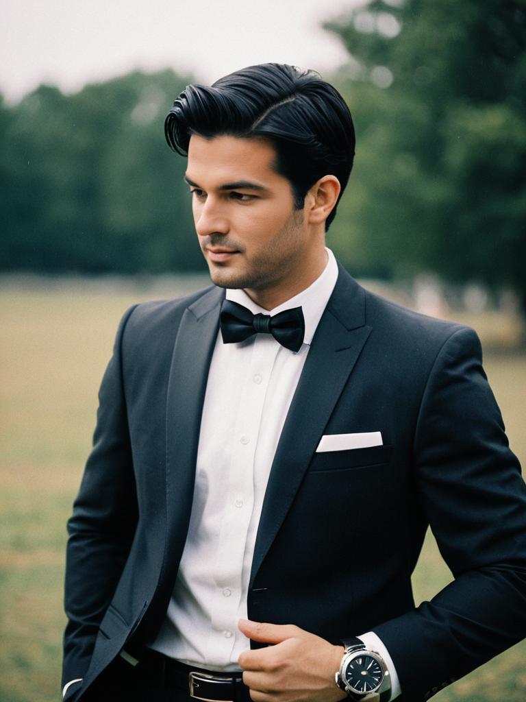 Party wear winter clothes, 1boy, male focus, solo, christmas tree, scarf, realistic, black hair, facial hair, red scarf, christmas, coat, looking at viewer, smile, blurry, mustache, blurry background, hands in pockets, upper body