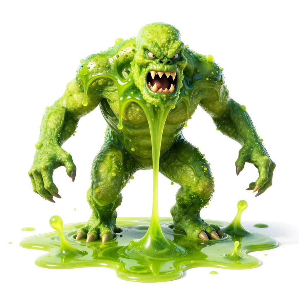 Green goo monster emerging from a bubbling toxic slime pool, oozing thick green liquid, sharp teeth, menacing stance, vibrant colors, highly detailed creature design