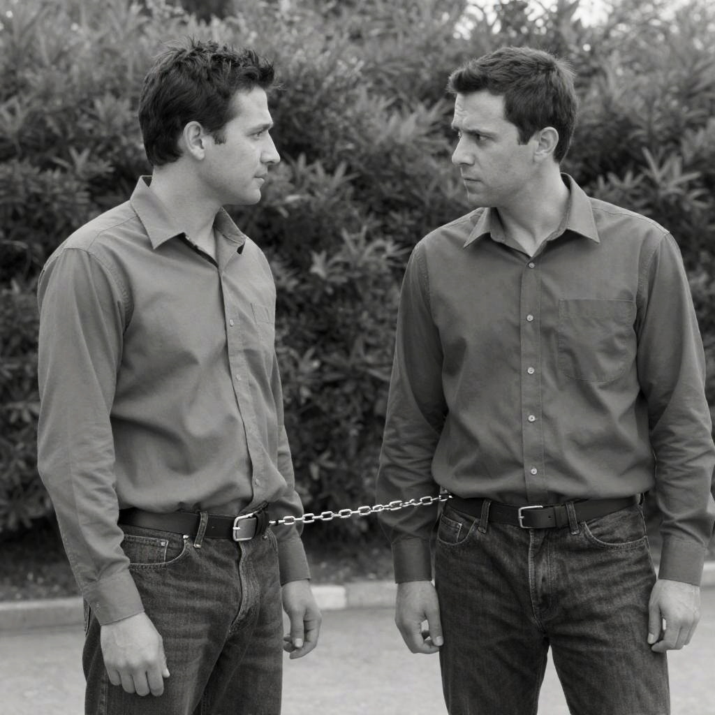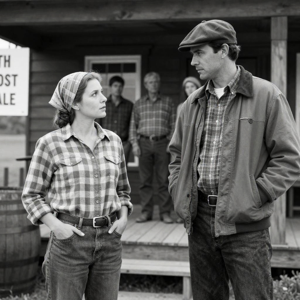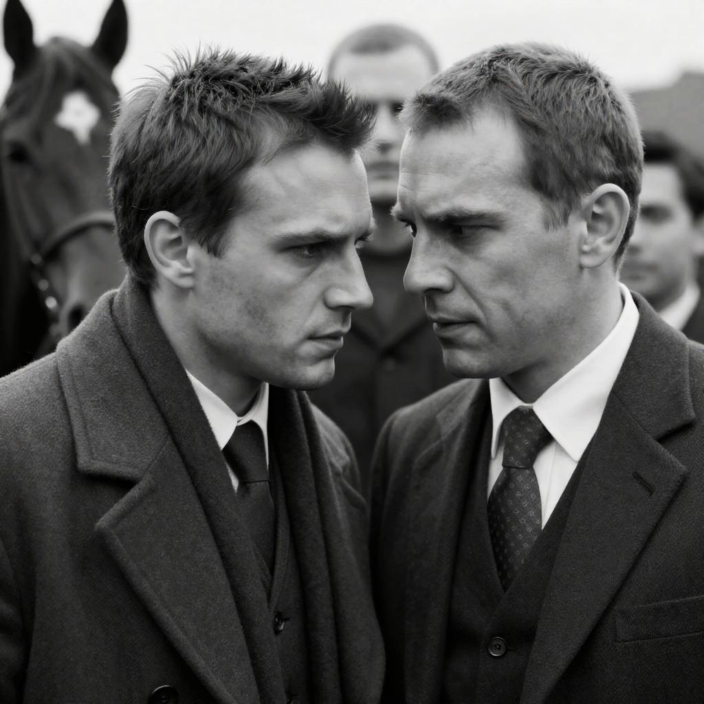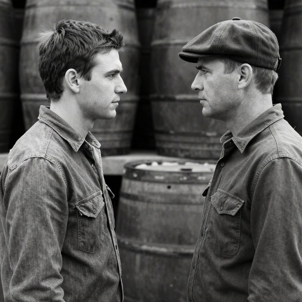 Black-and-white photograph of two men facing each other. Both have short hair; the man on the left wears a denim shirt, the man on the right wears a flat cap and a buttoned shirt. Background includes large, cylindrical barrels. Intense expressions.