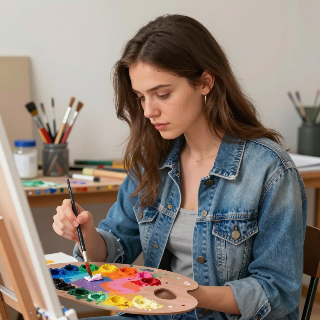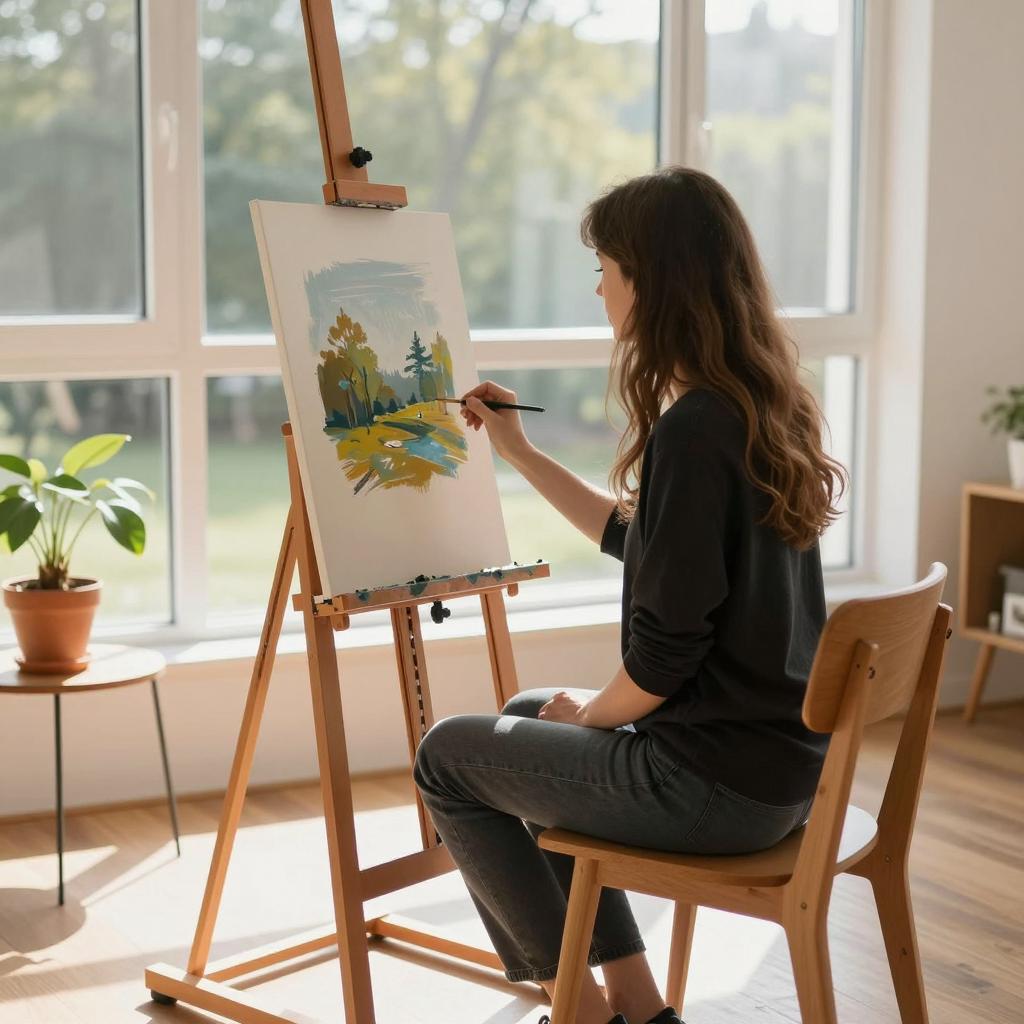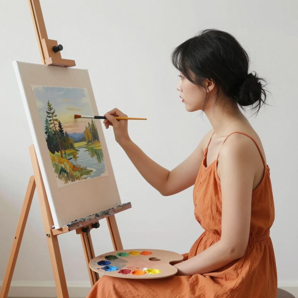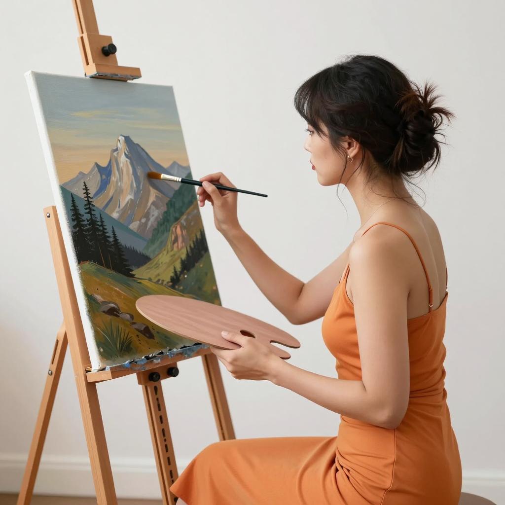 Asian woman with dark hair in a messy bun, wearing an orange tank dress and no shoes, painting on an easel. She holds a paintbrush in her right hand and a wooden palette in her left. The canvas depicts a mountain landscape. She sits on a wooden stool, painting in profile, facing left. White wall background.