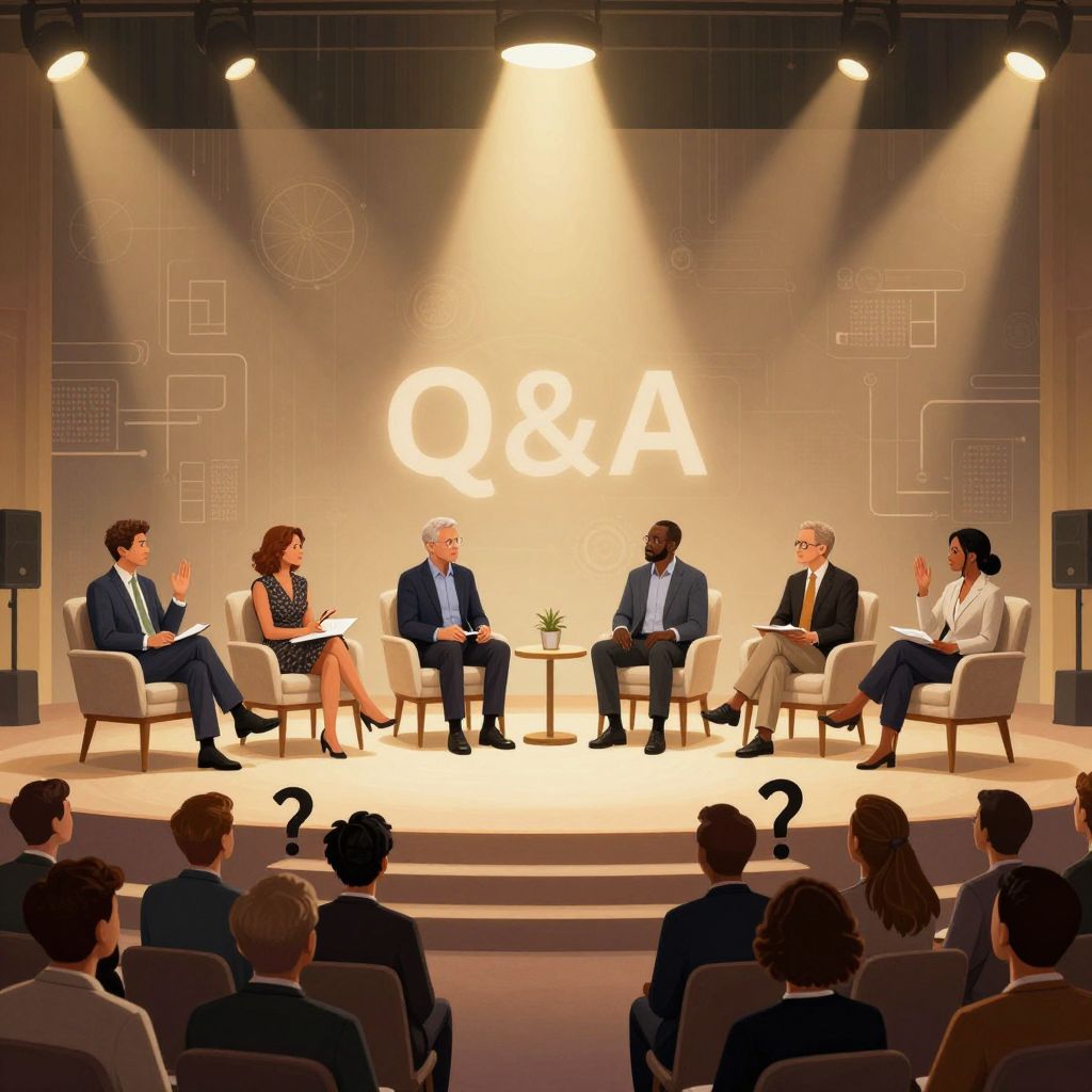 Illustration of a Q&A panel with experts seated on stage, audience raising hands to ask questions, spotlight on speakers, elegant backdrop with abstract technology motifs, warm color palette, high detail, digital art