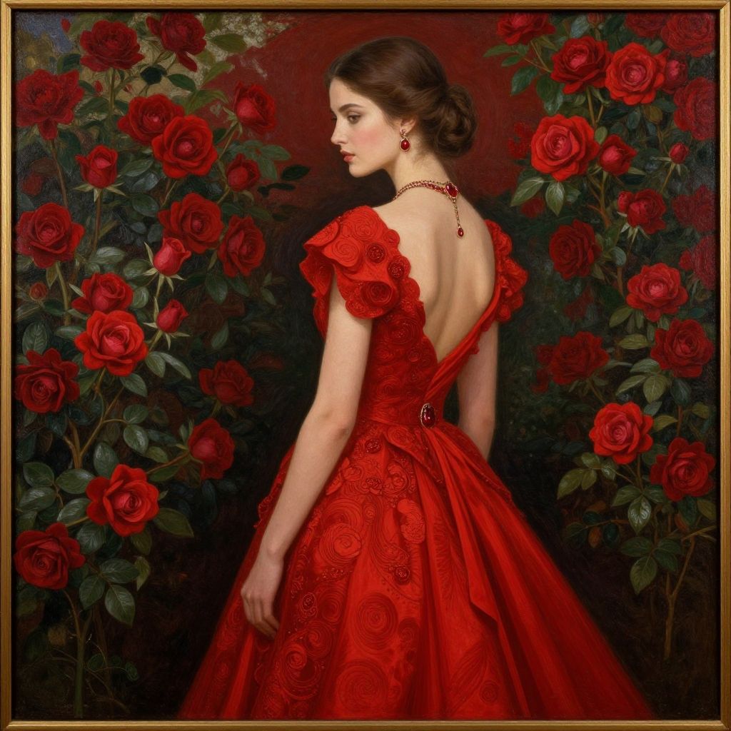 A painting of a gorgeous wall of red rose garden, in front is a young woman in a red dress of beautiful fabrics and textiles. hd elegant, back, red jewelry, in rich color, an ultra realistic, luxury fashion illustration masterpiece. Masterpiece, high definition