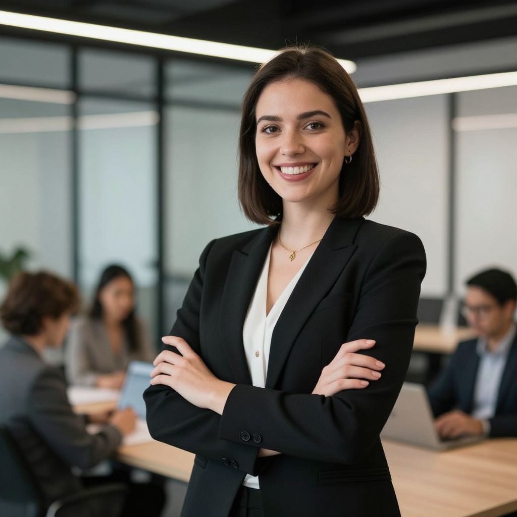 Cheerful businesswoman in a sleek black blazer stands confidently with arms crossed, smiling warmly at the camera in a modern office setting, featuring large windows, ambient lighting, and colleagues seated in the background.