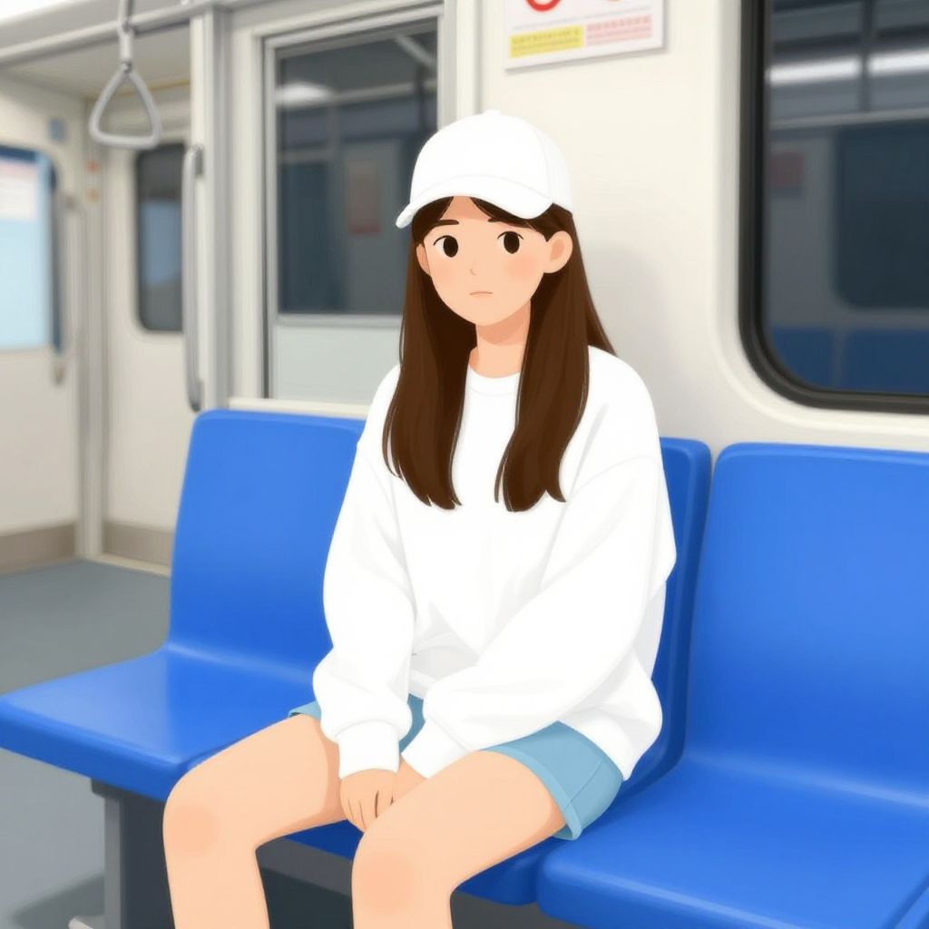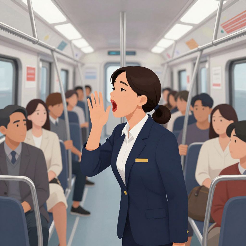 A digital illustration of a crowded subway car. A young Asian woman with dark hair in a low bun, wearing a navy blue business suit and white shirt, stands in the foreground, raising her right hand to her mouth as if speaking. She has a surprised or excited expression. The background shows several seated passengers, including men and women of various ages, mostly in business attire. The subway car has blue seats, fluorescent lighting, and metal poles. The overall style is cartoon-like with bright colors and clean lines.
