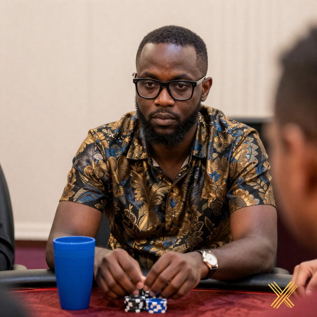 Portrait of a serious Black man with a short beard and glasses wearing a black shirt with gold and blue floral patterns, sitting at a poker table with a blue cup and stacks of black and blue poker chips in front of him.