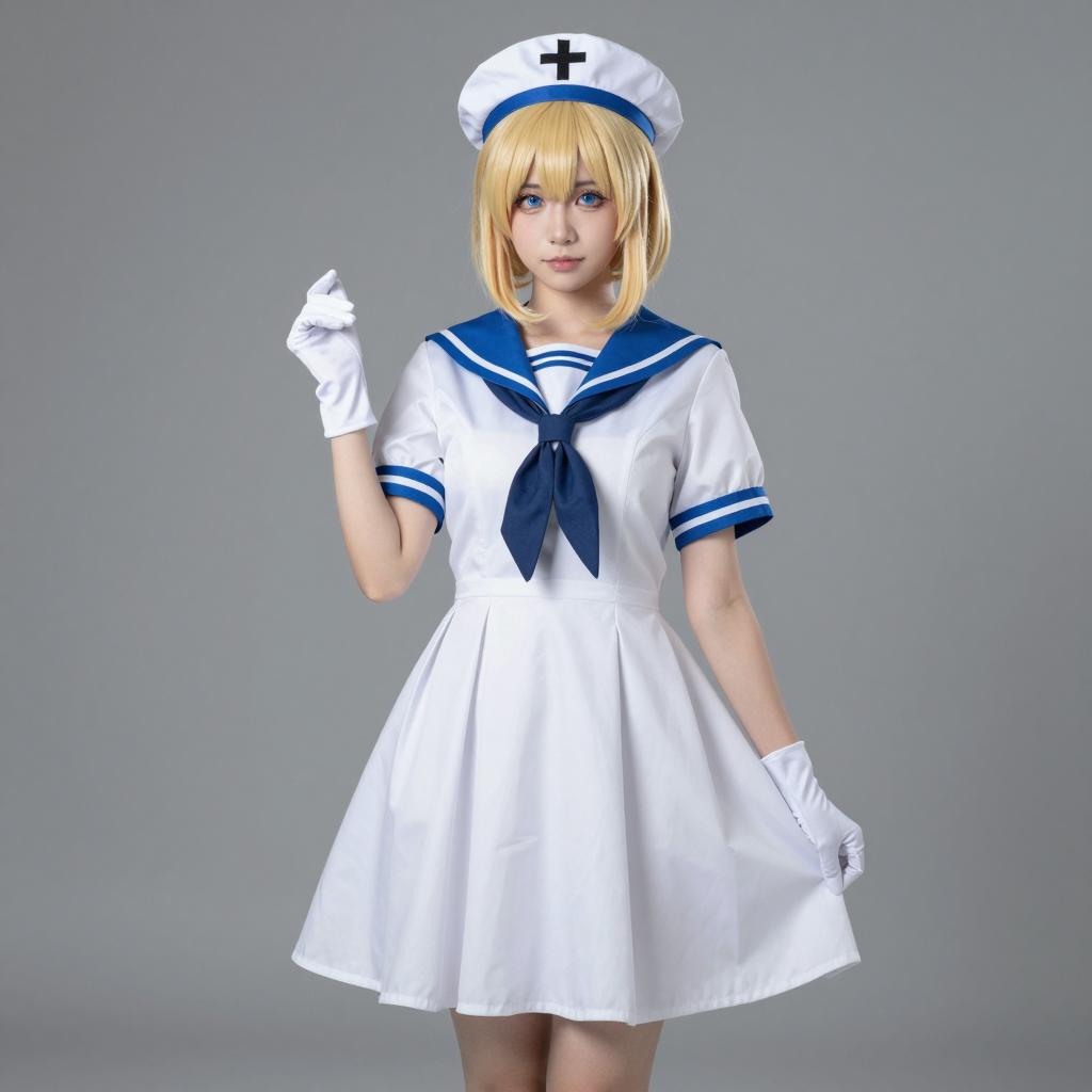 Photo-realistic cosplay photo of person in janus (kancolle) costume. Full body. Standing. Full length. 1girl, blue eyes, blonde hair, short hair, parted bangs, sailor hat, white gloves, sailor dress, white dress, white headwear, blue sailor collar, short sleeves, professional photoshoot