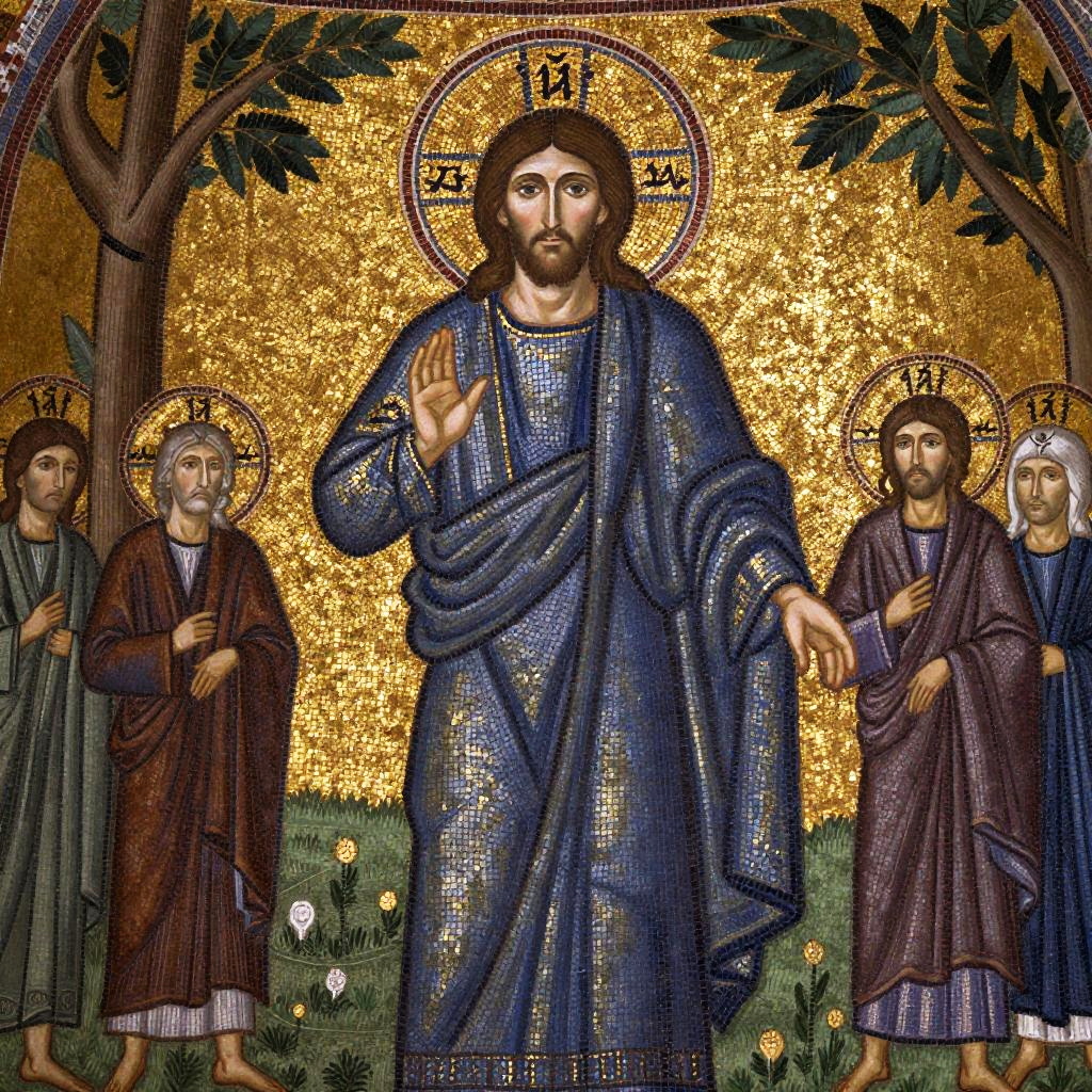 Jesus in the garden of Gethsemane, depicted as Jesus in a spiritual reverence moment. Rendered in Byzantine mosaic style with inspired by Early Christian art. Focus on golden halo, tessellated robes, symbolic iconography and glowing ambient light.
