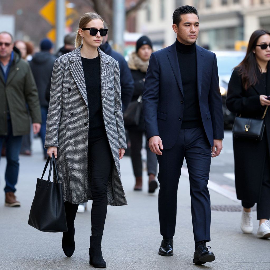 Photograph of a stylish couple walking in a city street; woman in black-and-white checkered coat, black bag, sunglasses; man in black suit