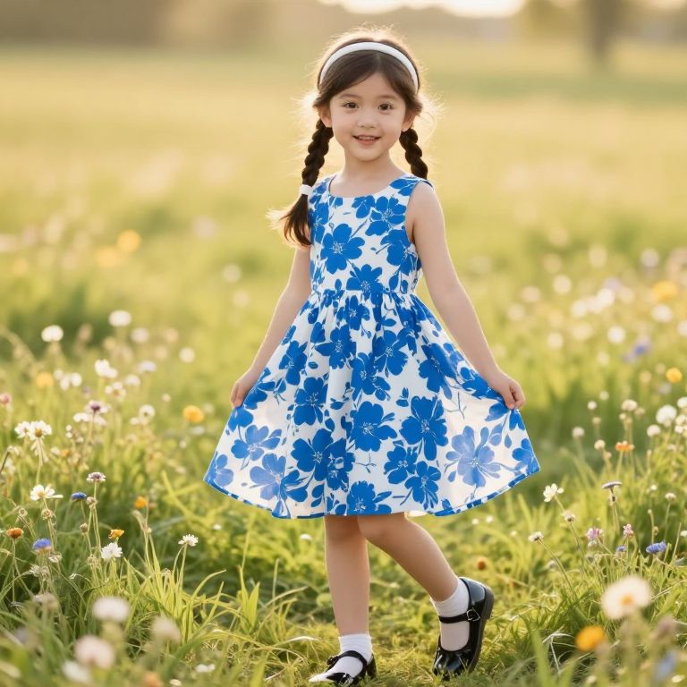 A beautiful young girl with vibrant, loose braids adorned with small beads, wearing a colorful green dress featuring a delicate floral pattern that flows gently across her body. She wears a wide, soft hat with a pom-pom on top, adding a playful and cheerful touch. A bright red belt accents her waist, tying neatly at the hips. She stands confidently in a sunny meadow, her expression warm and joyful, with a soft breeze lifting her hair and dress. The background is a serene, natural landscape with blooming flowers and trees, enhancing the cheerful and whimsical atmosphere.
