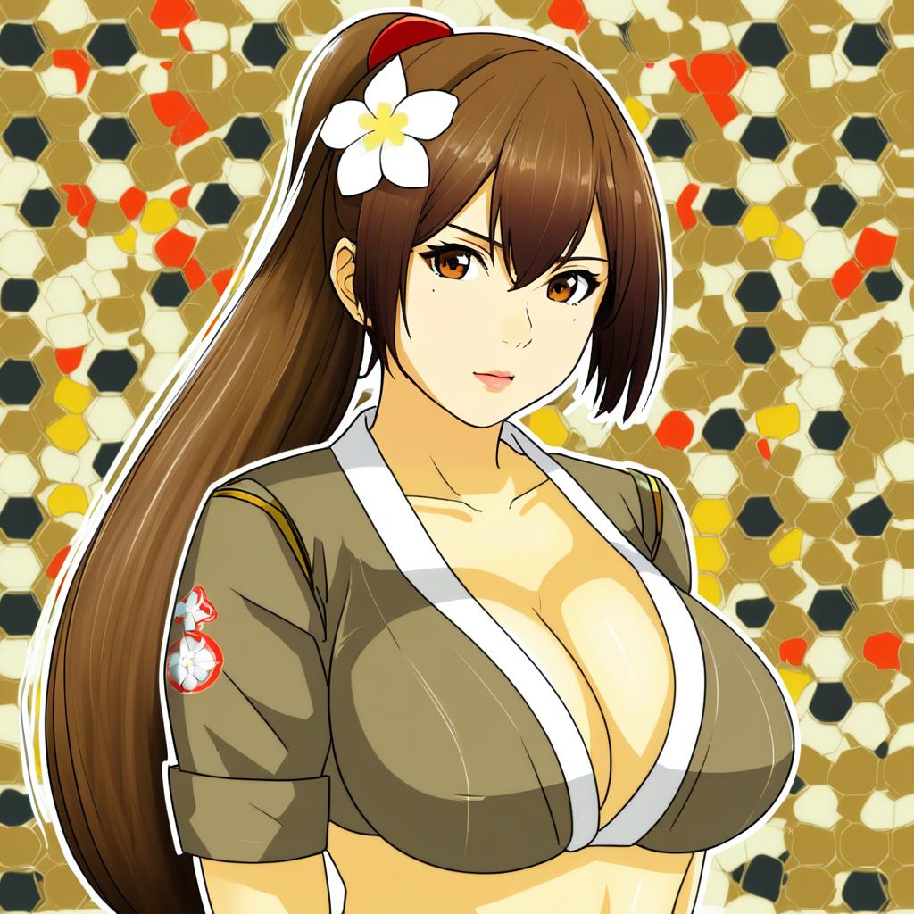 Digital illustration of an anime-style young woman with long brown hair tied in a ponytail adorned with a red and white flower. She has brown eyes, a mole under her eye, and hair strands between her eyes. She wears a cropped olive green shirt with rolled sleeves, revealing cleavage and navel. The background features abstract diagonal lines in earthy tones.