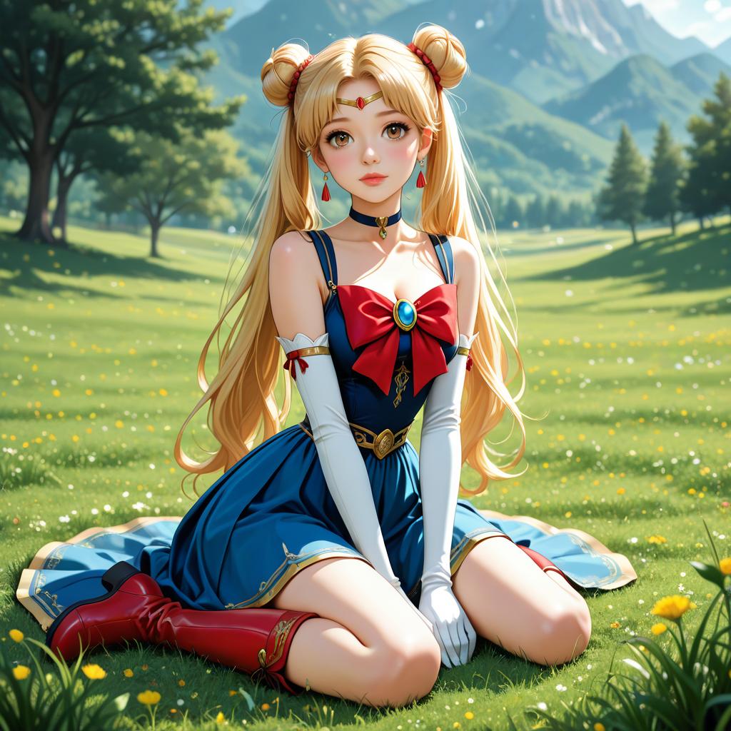 This is a digital anime-style drawing of a young woman with long blonde hair in two buns, wearing a blue dress with a red bow, white elbow-length gloves, and red boots. She has a red gem on her forehead, red earrings, and a blue gem on her chest. She is kneeling on a grassy field with yellow flowers, surrounded by trees and a mountainous background under a bright, sunny sky. The image has a vibrant, colorful, and slightly whimsical feel, with detailed shading and highlights that enhance the character's features and the natural setting.