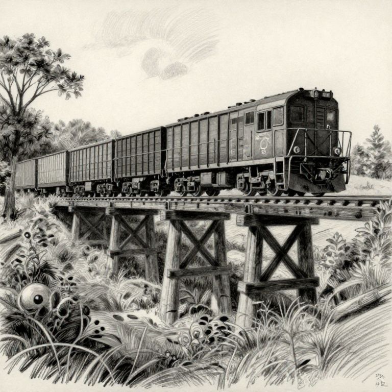 Train drawing images portraying a rustic countryside scene with a freight train passing old wooden bridges, created in charcoal and pastel textures, highlighting the contrast between nature and industrial elements.