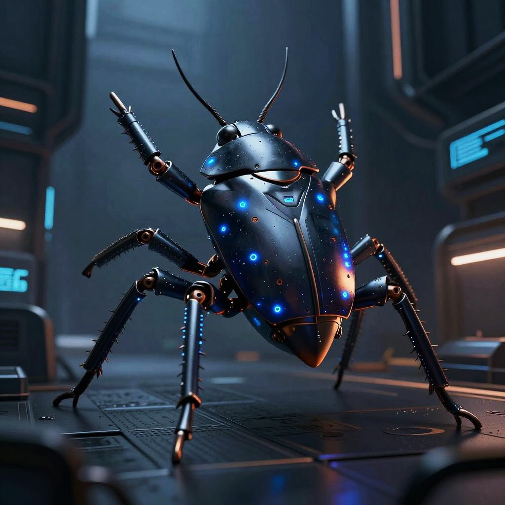 Ilustración futurista de patas de cucaracha robóticas, diseño biomecánico, luces neón azules, fondo cyberpunk, estilo digital art detallado y oscuro