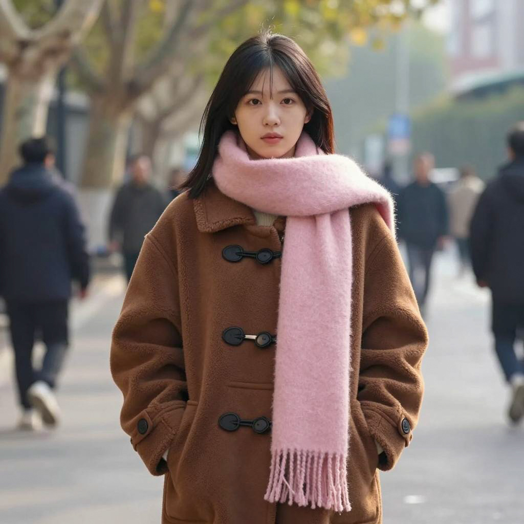 Oversized coat costume, photograph of young asian woman with straight black hair, wearing a brown shearling coat with black toggle buttons, and a pink scarf, standing on a sunny urban street, green trees in background, blurry pedestrians in the distance, soft natural light, daytime, realistic style, street photography, neutral expression, medium shot, urban setting