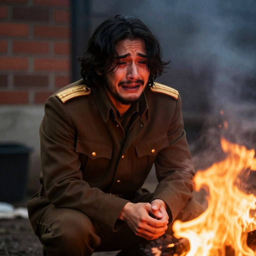 Photograph of a crying man with long black hair and beard, wearing a brown military-style jacket with gold epaulettes, kneeling in front of a bright orange fire. Smoke fills the background. Man's hands are clasped together in front of him. Brick wall in the background. Intense, sorrowful facial expression.